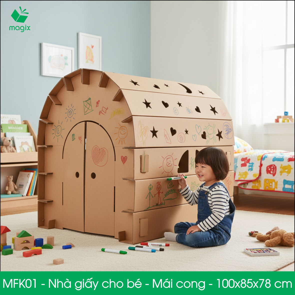 Bộ sản phẩm Nhà Giấy Carton gồm nhiều mảnh carton đã được cắt sẵn, gấp khúc sẵn. Phụ huynh nhận hàng chỉ việc lắp ghép các mảnh lại thành ngôi nhà hoàn chỉnh cho bé.