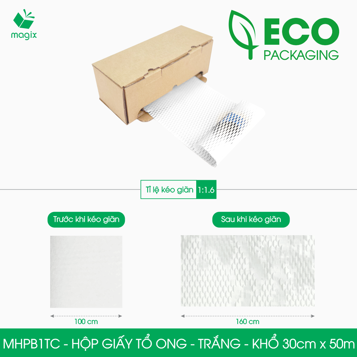 MHPB1TC - 30cm x 50m - Hộp giấy kraft tổ ong - Kraft trắng