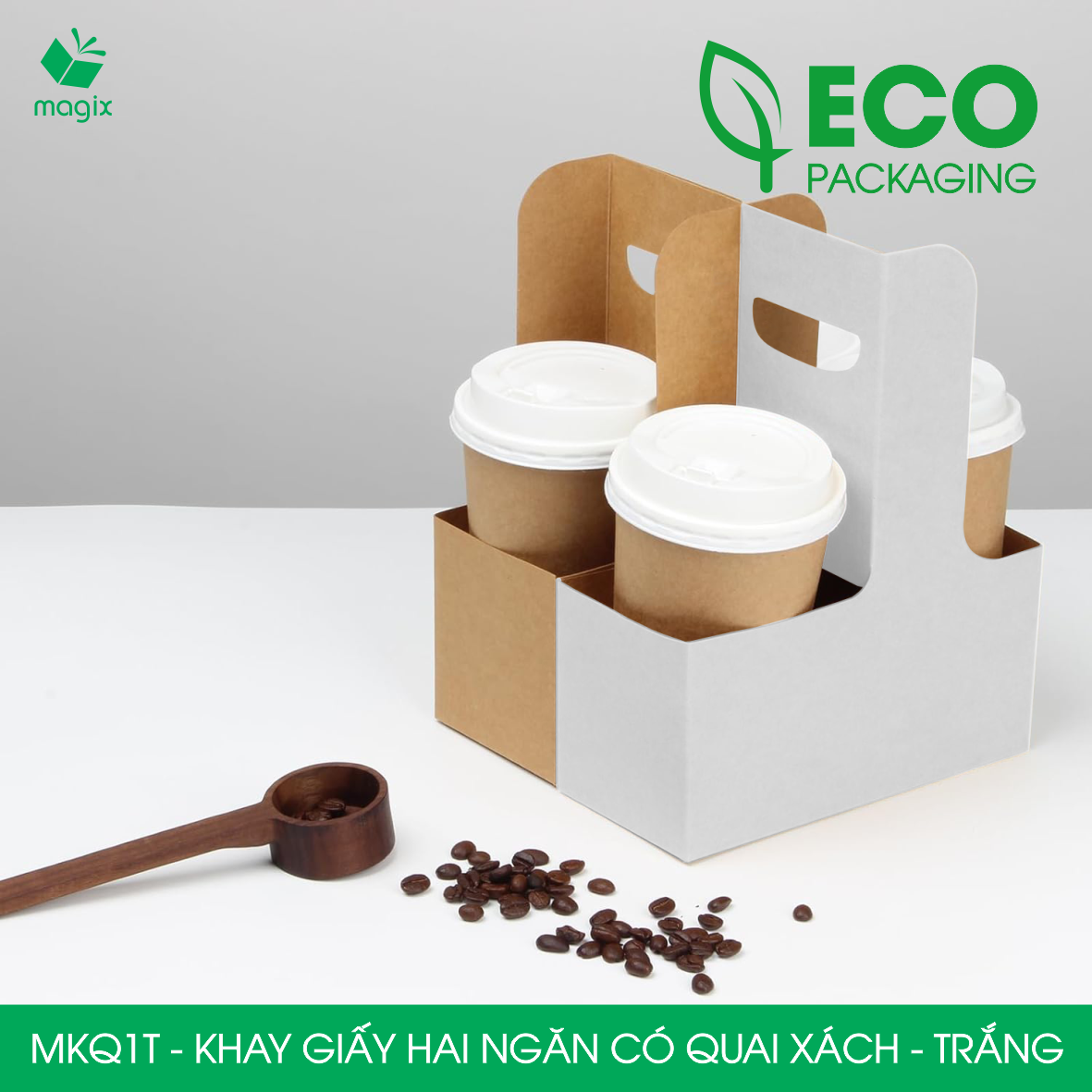 Khay giấy hai ngăn có quai xách - Tiện lợi, an toàn, thân thiện môi trường, được sử dụng phổ biến tại các quán cà phê, nhà hàng, quán ăn, shop bán online…